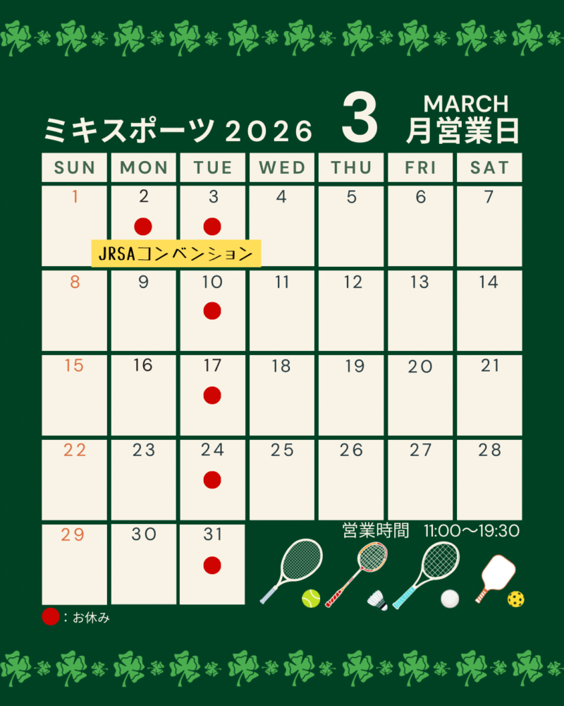 2026.02.12月営業日カレンダー🗓️2月24日(火)〜2月26日(木)臨時休業いたします。2月の営業日について 平素よりミキスポーツをご利用いただき、誠にありがとうございます。 2026年2月の営業日は、掲載の営業… more info